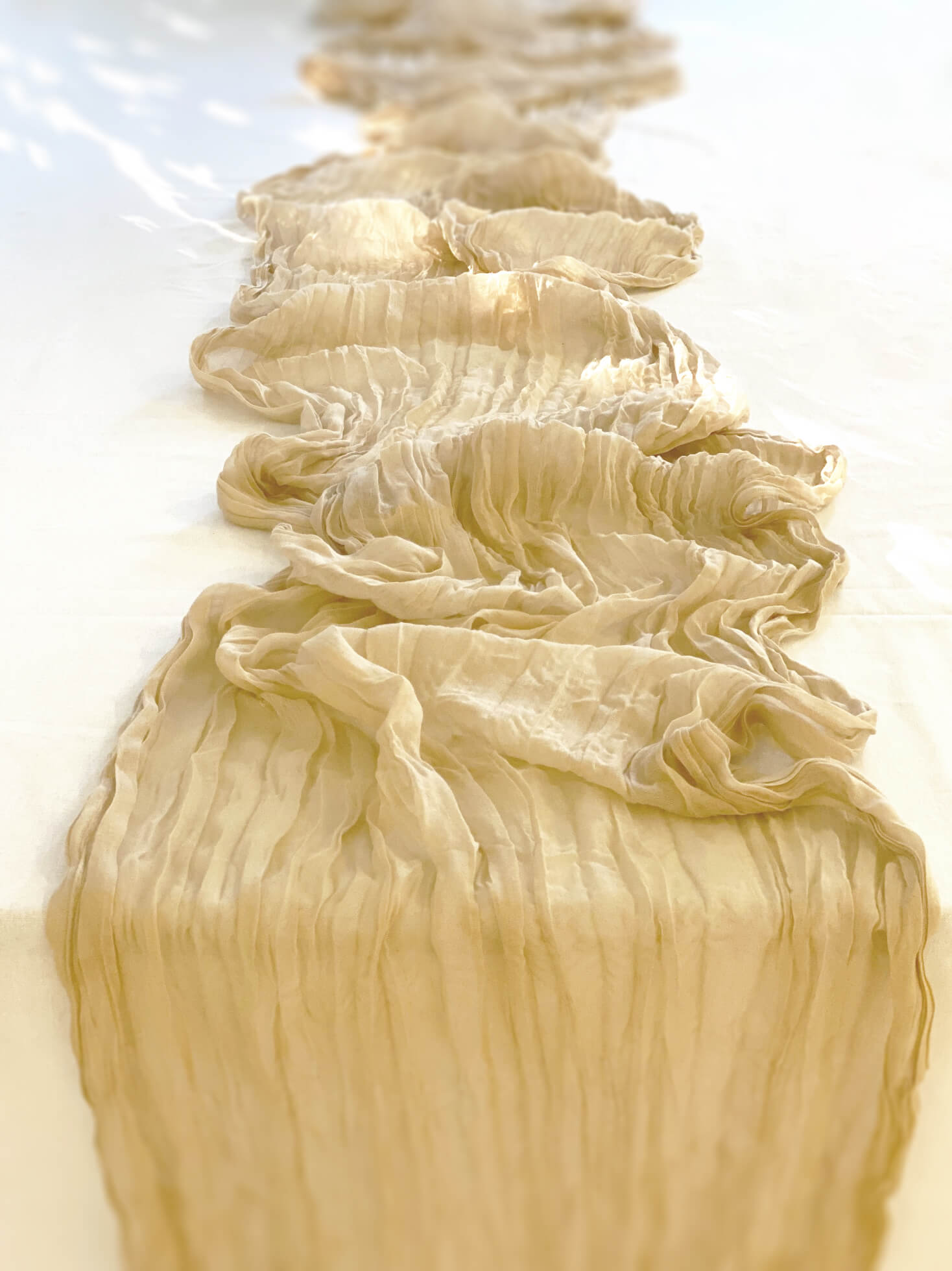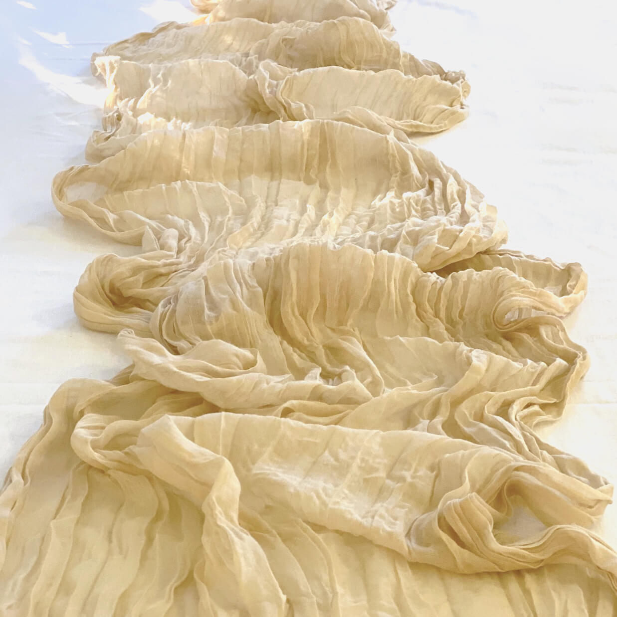 These cheesecloth runners are perfect for adding a romantic, yet casual feel to your event tablescapes. Toasted almond is a lovely rich light golden brown shade, hand dyed with Onion skins and Cutch extract. This sheer cheesecloth fabric has a slightly tighter weave than our other cheesecloth and all sides of the table-runners have been neatly finished with a stitched hem.