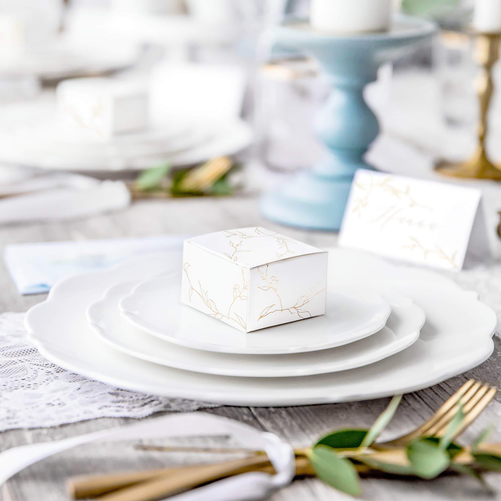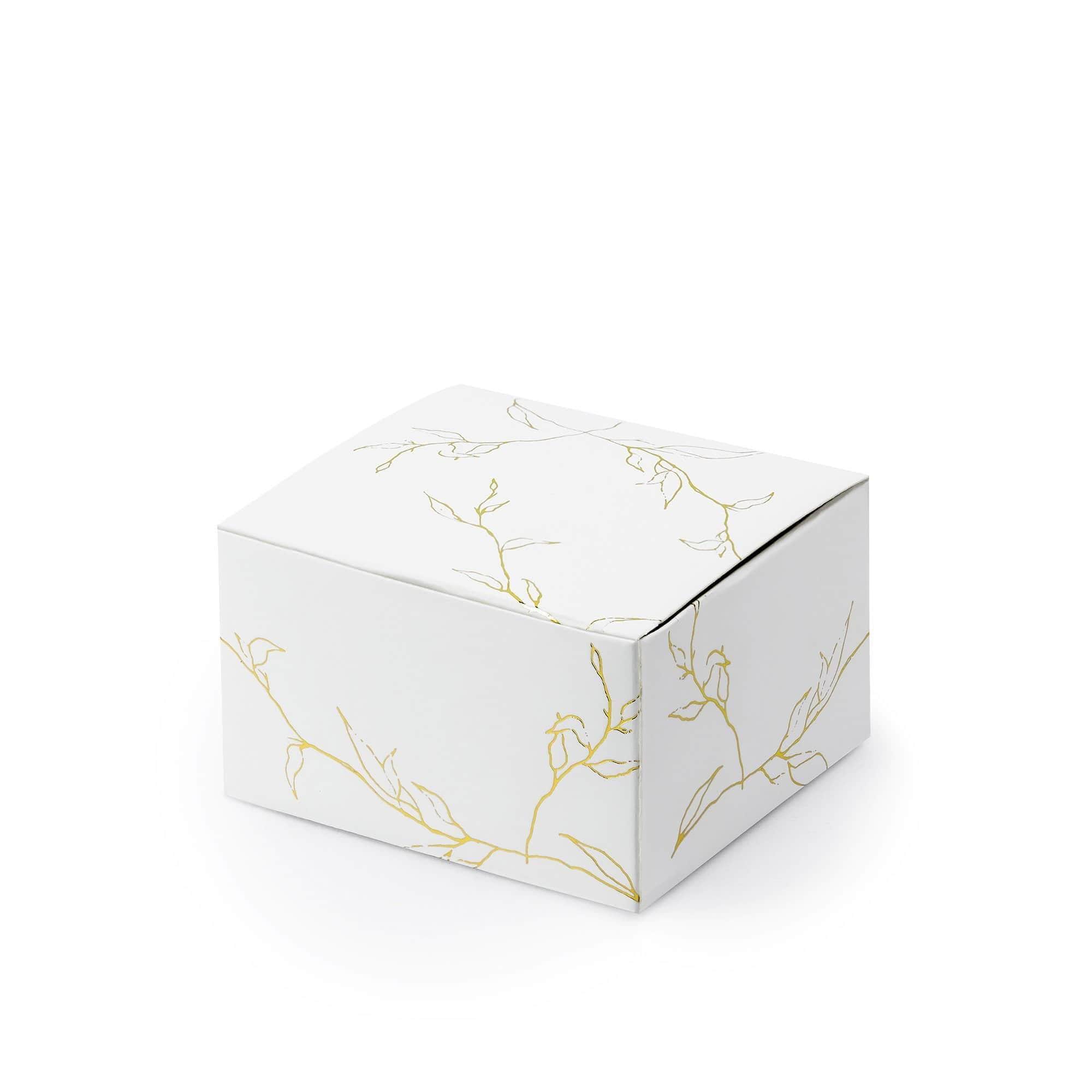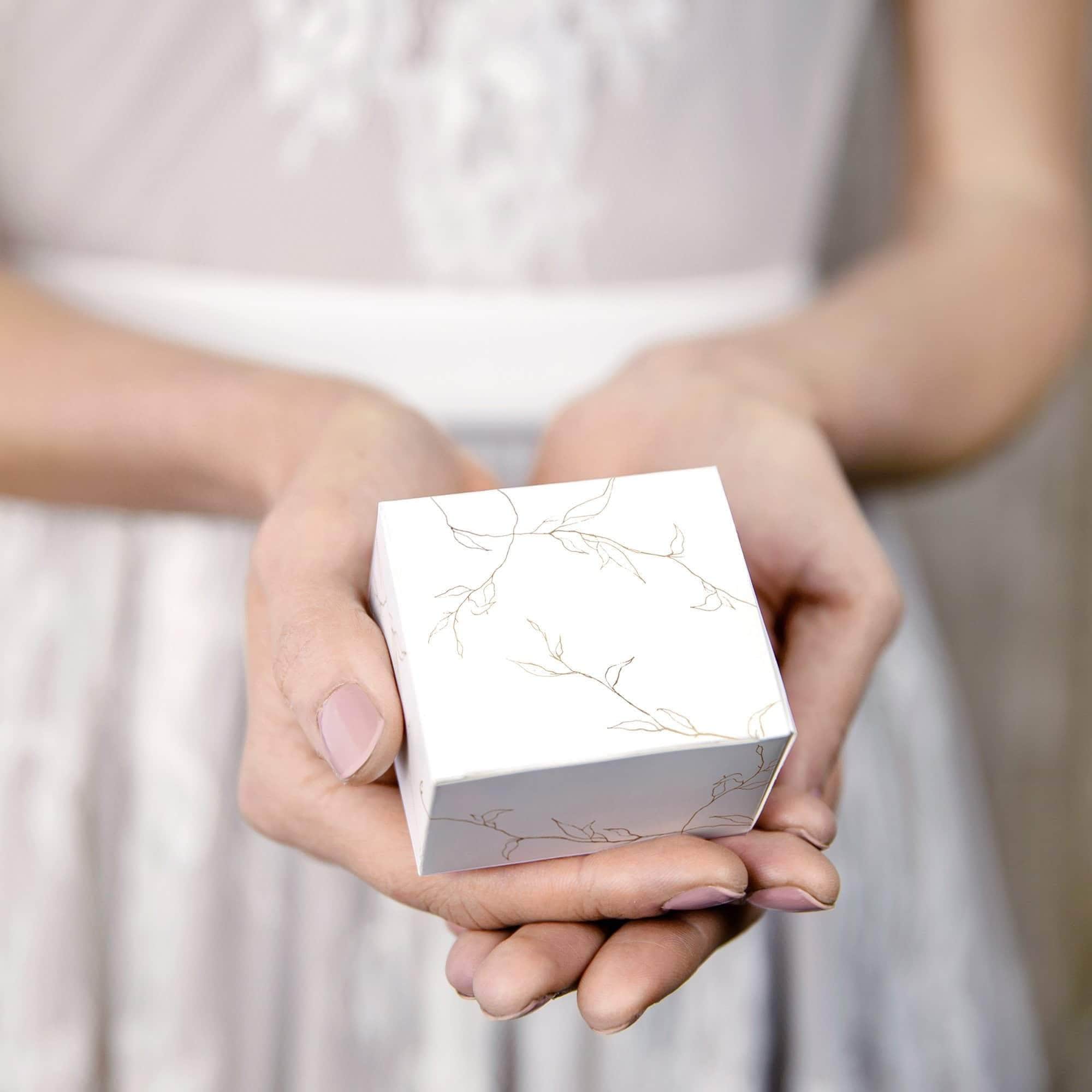 These lovely white Wedding favour boxes are printed with a delicate gold foil branch motif. They are the perfect size for gifting guests or friends with homemade chocolates, sweets, soap, jewellery or other thoughtful token of your thanks.